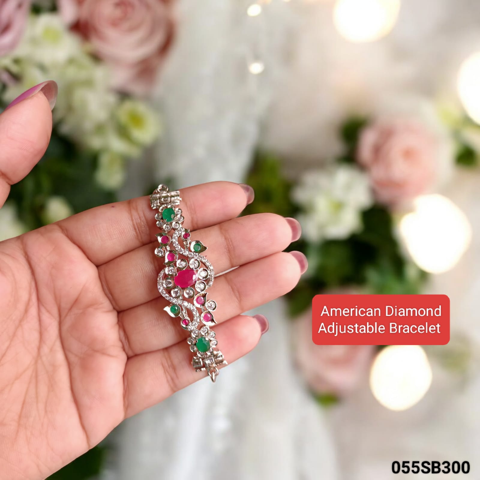 Elevate your wrist with our rhodium-plated American diamond adjustable bracelet. Crafted for timeless elegance, each link features sparkling simulated diamonds set in a sleek rhodium finish. Perfect for any occasion, this bracelet blends sophistication with adjustable comfort, making it a versatile addition to your jewelry collection.
