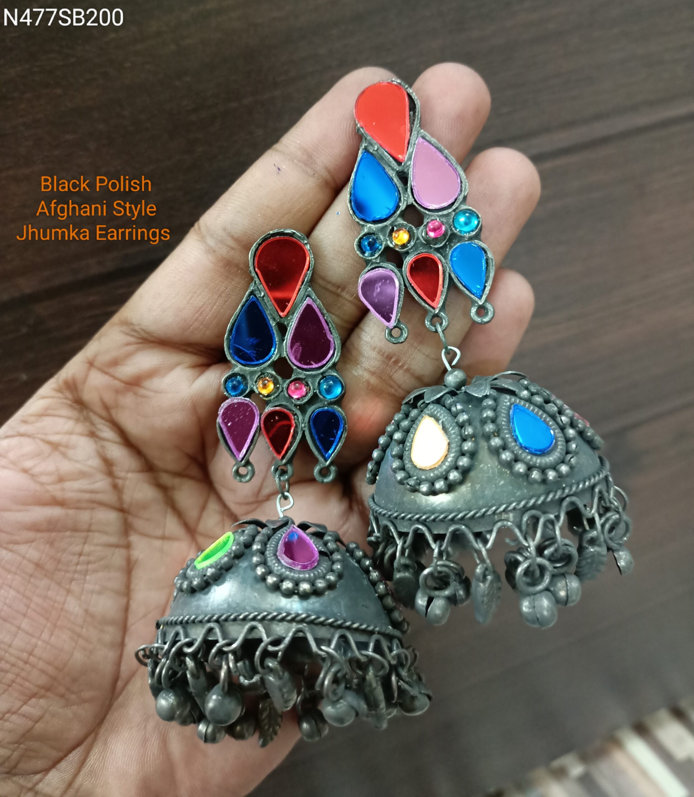 Black polish Afghani style jhumka earrings are stunning accessories that blend traditional Afghan design with a modern twist. These earrings typically feature a dome-shaped jhumka design with intricate patterns or embellishments, crafted from blackened silver or other metals treated with a dark coating. The Afghani style is characterized by its bold and ornate aesthetic, often incorporating elements like filigree work, beads, or dangling charms. The black polish adds depth and contrast to the earrings, enhancing their intricate detailing and giving them a contemporary edge. Perfect for adding a touch of exotic elegance to any outfit, black polish Afghani style jhumka earrings are sure to make a statement and turn heads wherever you go.