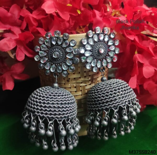 The Black Polish Jhumka earrings blend traditional elegance with contemporary style. Crafted with a sleek black polish, these jhumkas feature intricate detailing that adds a touch of sophistication to any ensemble. Their versatile design makes them perfect for both casual and formal occasions, while their unique charm effortlessly elevates your look. Add a dash of timeless allure to your jewelry collection with these exquisite black polish jhumka earrings.