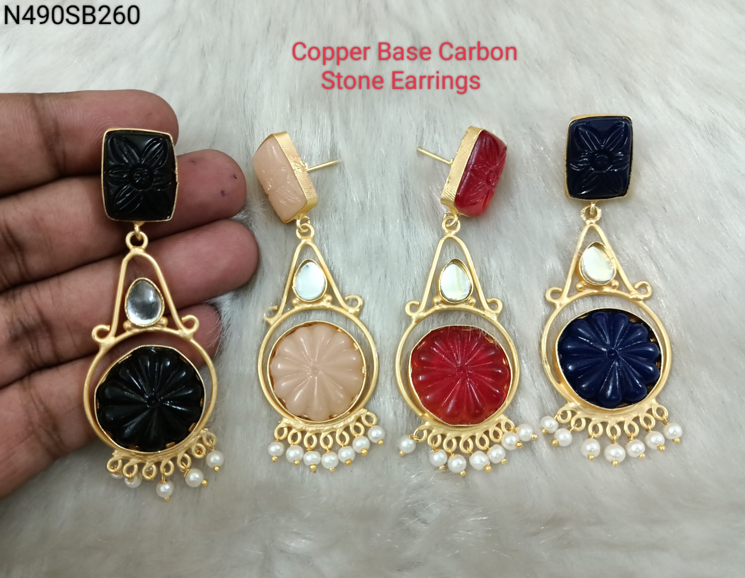 Copper-based carbon stone earrings are a unique and striking accessory that combines the warmth of copper with the sleekness of carbon stone. These earrings typically feature carbon stone, which is a type of stone known for its dark, lustrous appearance and smooth texture. Set in copper, the earrings offer a rich and earthy tone that complements the deep hues of the carbon stone. The combination of copper and carbon stone creates a bold and contemporary aesthetic, resulting in earrings that are both edgy and elegant. Whether worn as a statement piece or to add a touch of modern flair to an outfit, copper-based carbon stone earrings are sure to make a stylish impact.