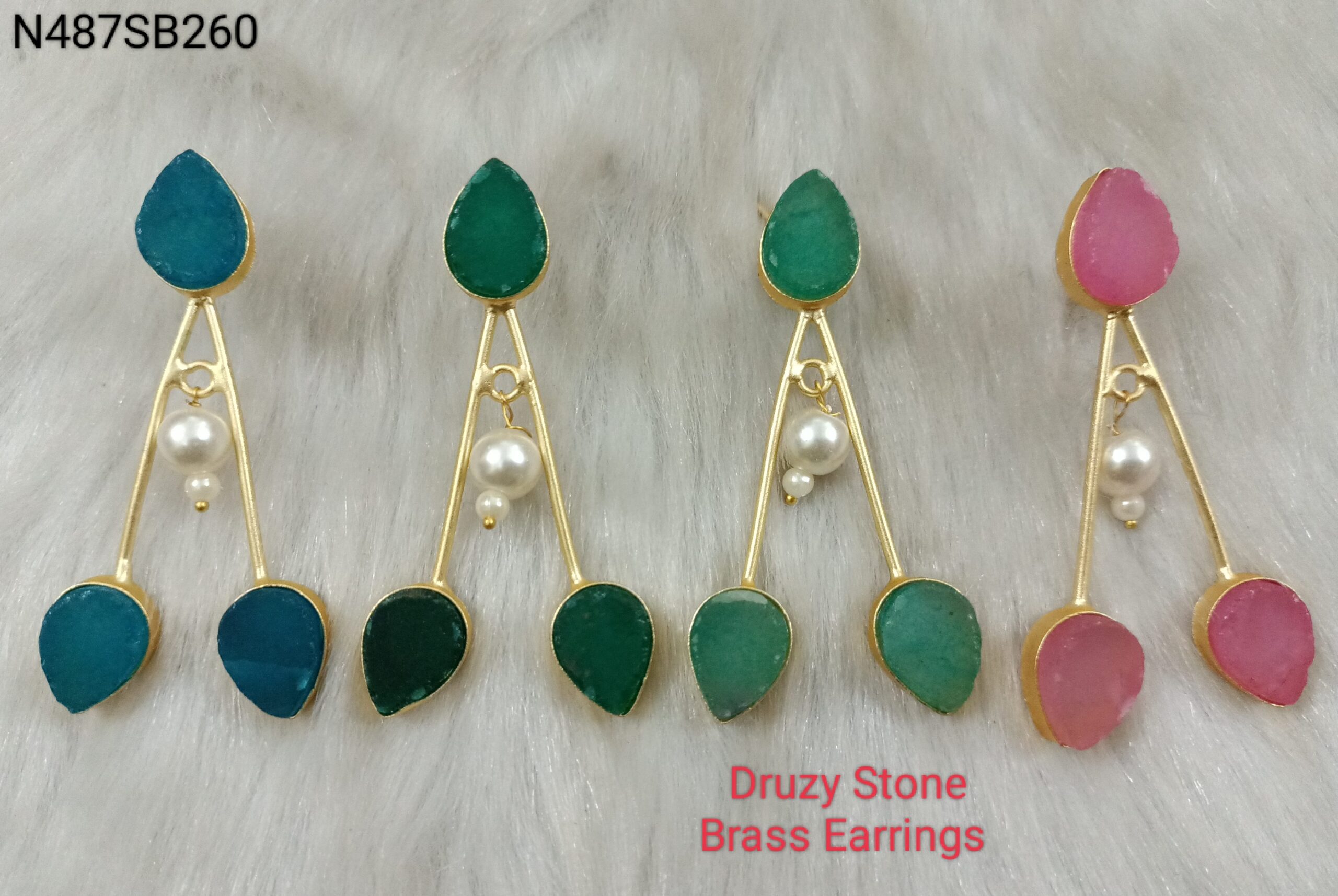 Druzy stone brass earrings are a stunning accessory that combines the natural beauty of Druzy stones with the rustic charm of brass. These earrings typically feature Druzy stones, which are tiny crystals that form on the surface of other stones, creating a sparkling and textured effect. Set in brass, these earrings offer a warm and earthy aesthetic that complements the shimmering quality of the Druzy stones. The brass setting provides a rustic yet elegant backdrop for the stones, enhancing their natural allure. Whether worn with casual or dressier outfits, Druzy stone brass earrings add a touch of bohemian sophistication to any look.