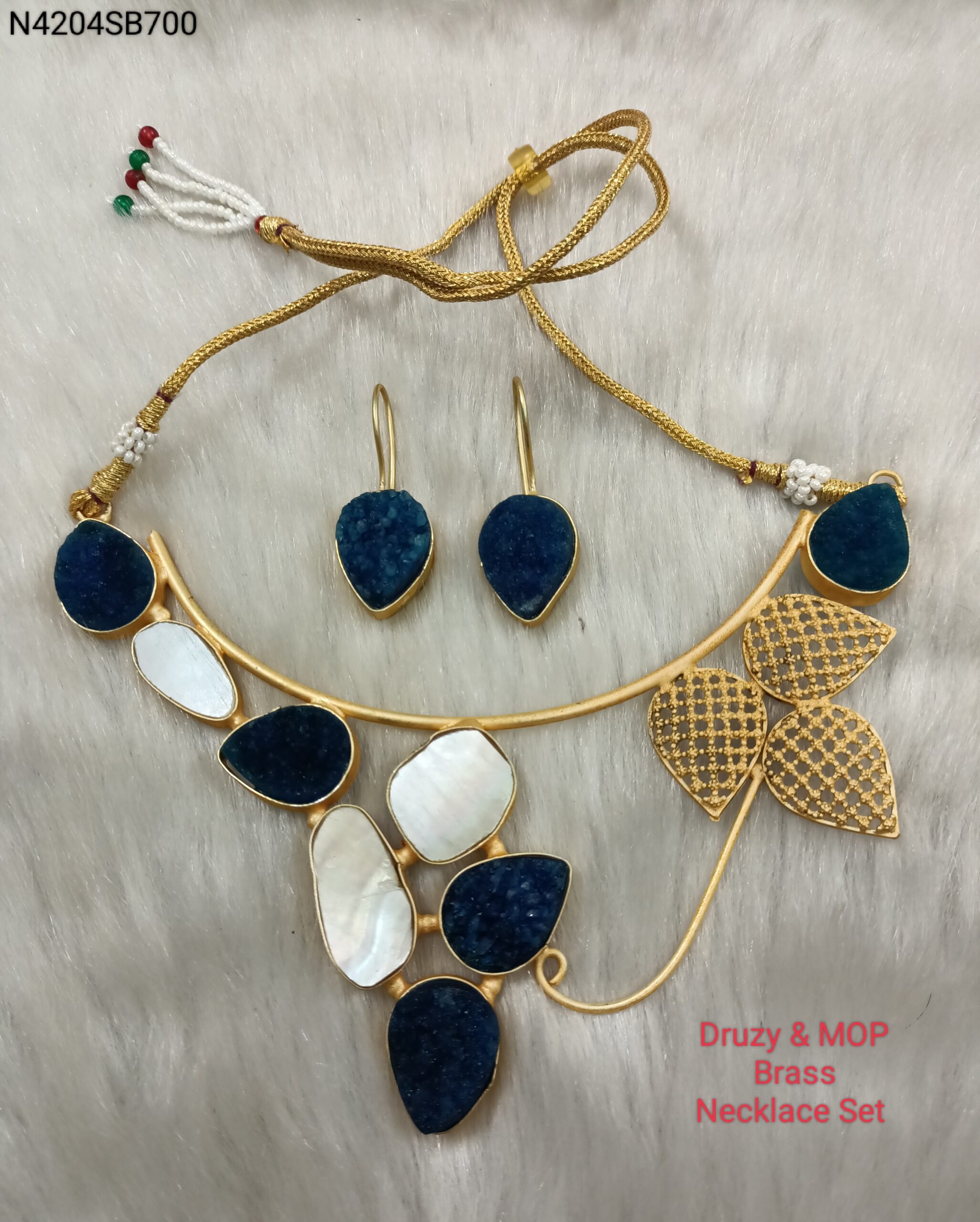 A Druzy stone and MOP (Mother of Pearl) brass necklace set is a captivating ensemble that combines the raw beauty of Druzy stones with the iridescent elegance of Mother of Pearl, all set in brass. The necklace features Druzy stones, which are naturally occurring crystals that sparkle with tiny crystals over their surface, adding a touch of natural allure to the piece. Complementing the Druzy stones are Mother of Pearl accents, known for their pearlescent luster and smooth, opalescent appearance. The brass setting adds a warm and rich tone to the set, enhancing its overall appeal. This necklace set is perfect for adding a unique and sophisticated touch to both casual and formal outfits, making it a versatile and eye-catching accessory option.