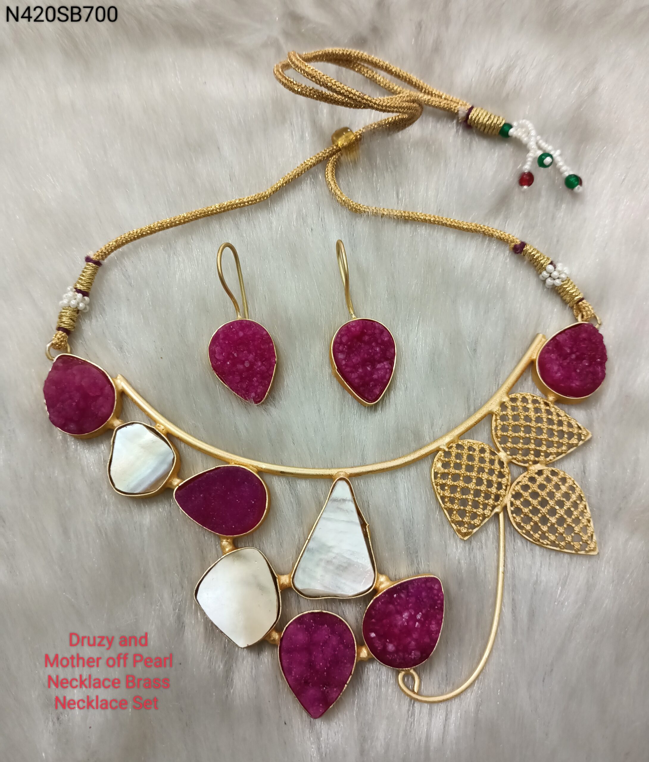 A Druzy stone and MOP (Mother of Pearl) brass necklace set is a captivating ensemble that combines the raw beauty of Druzy stones with the iridescent elegance of Mother of Pearl, all set in brass. The necklace features Druzy stones, which are naturally occurring crystals that sparkle with tiny crystals over their surface, adding a touch of natural allure to the piece. Complementing the Druzy stones are Mother of Pearl accents, known for their pearlescent luster and smooth, opalescent appearance. The brass setting adds a warm and rich tone to the set, enhancing its overall appeal. This necklace set is perfect for adding a unique and sophisticated touch to both casual and formal outfits, making it a versatile and eye-catching accessory option.