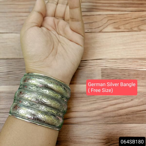 The German Silver Bangle (free size) is a versatile and stylish accessory crafted from a nickel alloy known as German silver, which resembles the appearance of sterling silver. Its “free size” design means it can easily adjust to fit various wrist sizes, offering flexibility and comfort. Featuring intricate designs and often adorned with embellishments like beads or motifs, these bangles add a touch of ethnic charm to any outfit. Perfect for both casual and formal occasions, the German Silver Bangle (free size) is a timeless addition to any jewelry collection.