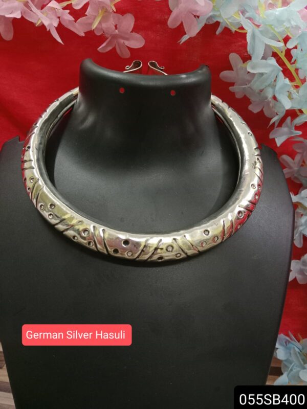 Discover timeless elegance with our German silver hasuli. Handcrafted with intricate designs and a lustrous finish, each piece reflects the beauty of traditional craftsmanship. Perfect for adding a touch of cultural flair to your wardrobe, this necklace is a statement of grace and sophistication.