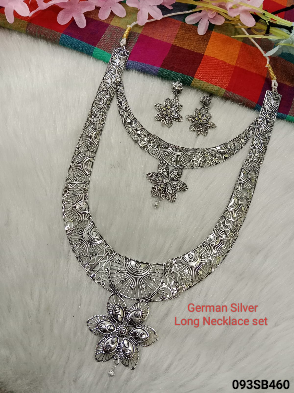 A German silver long necklace set typically comprises a necklace, earrings, and sometimes a matching bracelet, all made from German silver. German silver, also known as nickel silver, is an alloy primarily composed of copper, nickel, and zinc, with no actual silver content despite its name. It’s valued for its durability, affordability, and silver-like appearance. These sets often feature intricate designs, sometimes adorned with stones or beads, making them popular choices for both casual and formal occasions. They offer a stylish alternative to sterling silver jewelry at a more budget-friendly price point.