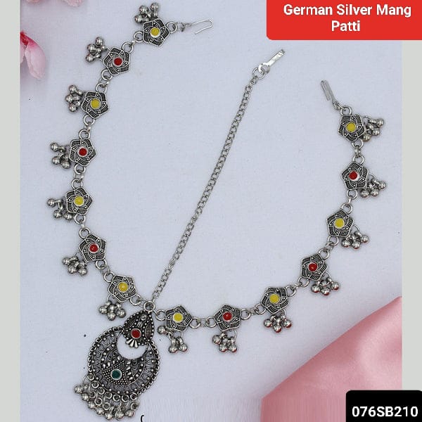 The German Silver Mang Patti is a traditional yet stylish headpiece that adds a touch of elegance to any ensemble. Crafted from durable German silver, this mang patti features intricate designs inspired by Indian heritage and culture. Typically worn along the hairline, it complements various hairstyles and occasions, from weddings to festivals. With its adjustable design, it offers a comfortable fit for different head sizes. The German Silver Mang Patti is a versatile accessory that effortlessly enhances your look with its timeless charm and sophistication.