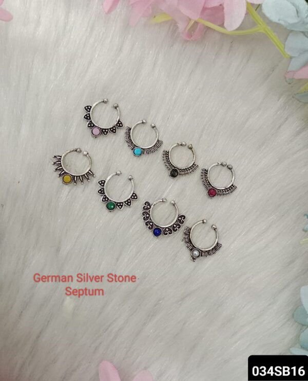 Accentuate your unique style with our German silver septum ring adorned with a stunning stone. Crafted with intricate detailing and high-quality materials, this septum ring combines the rustic charm of German silver with the elegance of a genuine stone. The adjustable design ensures a comfortable fit, while the eye-catching stone adds a touch of sophistication to any look. Elevate your ensemble with this versatile piece that effortlessly captures the essence of bohemian chic.