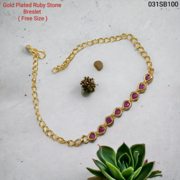 Radiate elegance with our Gold-Plated Ruby Stone Bracelet, a captivating blend of sophistication and glamour. Crafted with meticulous attention to detail, this bracelet features lustrous gold plating adorned with vibrant ruby stones, adding a touch of opulence to your ensemble. The rich hue of the rubies creates a striking contrast against the gleaming gold, enhancing the bracelet’s allure. Perfect for adding a touch of luxury to both casual and formal attire, this bracelet is sure to become a cherished favorite in your collection.