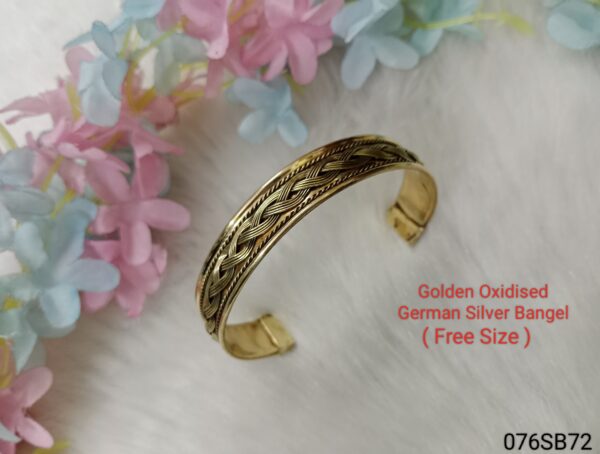 A “Golden German Bangle” suggests a bangle made of gold with a German design or possibly crafted in Germany. “Free size” typically indicates that the bangle is adjustable to fit various wrist sizes, offering convenience and flexibility in wearing. Gold jewelry, known for its elegance and timeless appeal, especially when combined with intricate designs or craftsmanship, can be a cherished accessory for many. This type of bangle would likely complement a variety of outfits and occasions, adding a touch of sophistication to any ensemble.