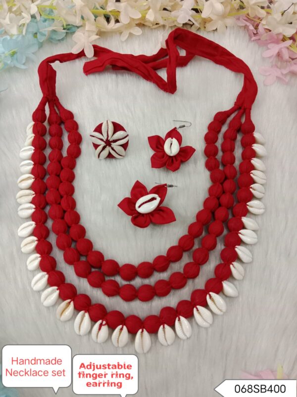 Welcome to our enchanting world of handmade jewelry, where the beauty of natural sea shells meets the artistry of fabric crafting. Our exquisite necklace set, complete with a matching finger ring, is a celebration of organic elegance and skilled craftsmanship.