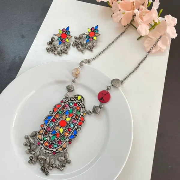Add a vibrant touch to your ensemble with our multicolor necklace set. This eye-catching set features a beautifully crafted necklace adorned with an array of colorful beads or stones, accompanied by coordinating earrings for a complete look. Perfect for adding a pop of color to any outfit, whether it’s for a festive occasion or everyday wear, this necklace set exudes charm and versatility with its playful yet elegant design.