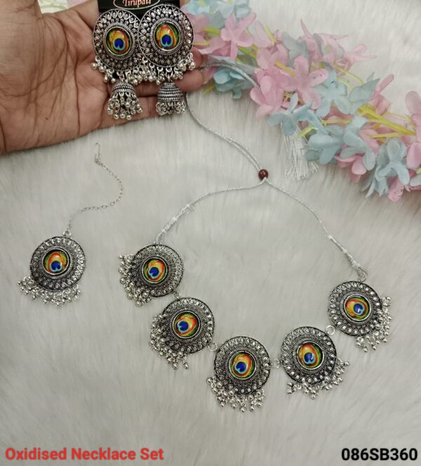 Indulge in timeless elegance with our Oxidized Necklace Set. This exquisite ensemble features a necklace and matching earrings, each meticulously crafted with intricate detailing and a striking oxidized finish. The necklace boasts a graceful design that drapes elegantly around the neck, while the earrings complement it with their delicate beauty. Perfect for adding a touch of sophistication to any outfit, this set is a must-have addition to your jewelry collection.