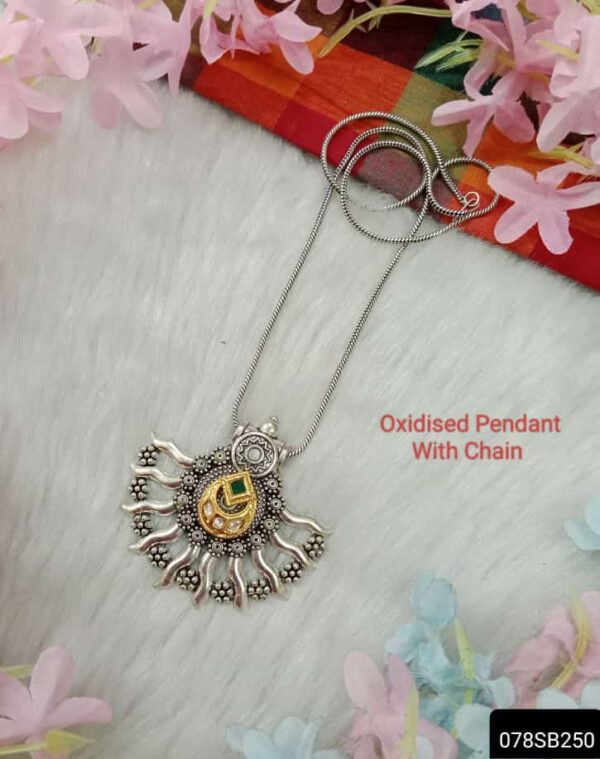 The Oxidized Pendant with Chain is a stylish accessory that exudes a vintage charm. The pendant is crafted from oxidized metal, giving it a distinctively weathered appearance with darkened accents. This antiqued finish adds character and depth to the pendant’s design. Paired with a matching oxidized chain, the pendant hangs elegantly around the neck, creating a striking focal point. Whether adorned with intricate filigree work, symbolic motifs, or geometric patterns, these pendants often showcase exquisite craftsmanship and cultural influences. Versatile enough for both casual and formal occasions, the Oxidized Pendant with Chain is a timeless piece that adds a touch of sophistication to any ensemble.
