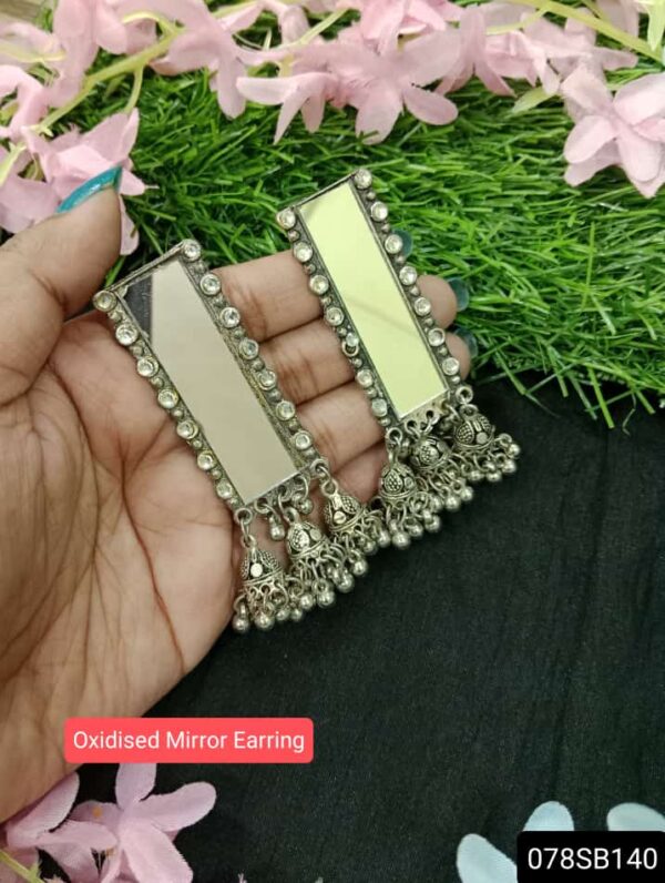 Oxidized mirror earrings are often handmade by skilled artisans, who meticulously craft each piece to ensure quality and attention to detail. They are versatile accessories that can add a bold statement to both casual and formal outfits, making them a popular choice for fashion-forward individuals looking to elevate their look with a touch of sophistication and originality.