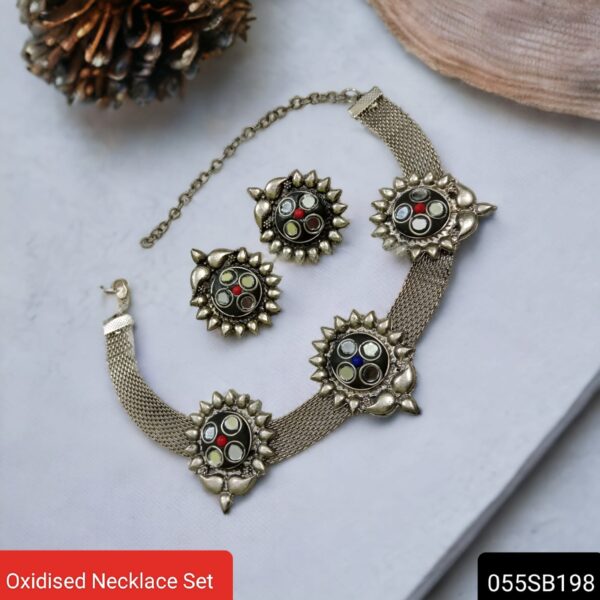 Oxidized necklace sets are captivating jewelry ensembles characterized by their darkened or antique finish, achieved through a process called oxidation. These sets typically include a necklace paired with matching earrings or other coordinating pieces, all featuring the distinctive oxidized look.