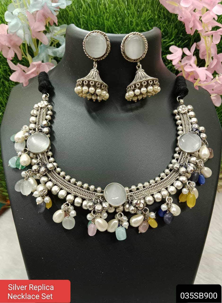 The silver replica necklace set captures the essence of elegance and sophistication in its design. Crafted meticulously from sterling silver, this ensemble replicates the beauty and allure of classic necklace sets at a more accessible price point. Adorned with intricate detailing and exquisite craftsmanship, each piece exudes a timeless charm that enhances any ensemble. Whether featuring sparkling gemstones, intricate filigree work, or elegant patterns, the silver replica necklace set offers versatility and style for various occasions. Perfect for those who appreciate the allure of fine jewelry and seek to make a statement with their accessories.