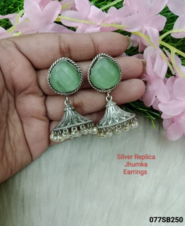 The silver replica jhumka earring embodies the timeless allure of traditional Indian jewelry in a beautifully crafted design. Meticulously made from sterling silver, these earrings replicate the intricate elegance of classic jhumka designs. Featuring delicate filigree work, dangling beads, or embellished patterns, each piece exudes sophistication and charm. With their versatile appeal, silver replica jhumka earrings are perfect for adding a touch of cultural richness to any ensemble, whether for festive occasions or everyday wear. A timeless addition to any jewelry collection, these earrings capture the essence of Indian heritage and craftsmanship with a contemporary twist.