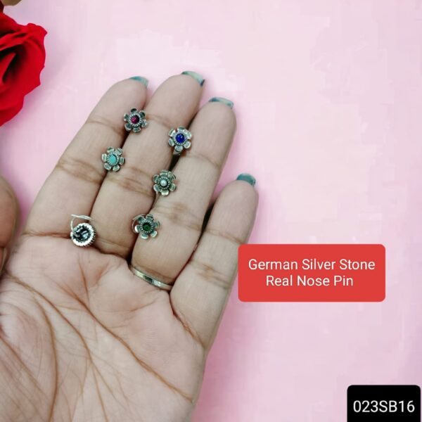 The German silver false stone nose pin offers a stylish and elegant accessory for adding a touch of sophistication to any look. Crafted from durable German silver, this nose pin features a false stone setting, creating the illusion of a sparkling gemstone without the added weight or expense. The silver hue adds a timeless appeal, while the delicate design makes it suitable for both casual and formal occasions. Whether worn alone for a subtle statement or paired with other nose jewelry for a more intricate look, the German silver false stone nose pin is a versatile accessory that adds a touch of glamour to any ensemble.