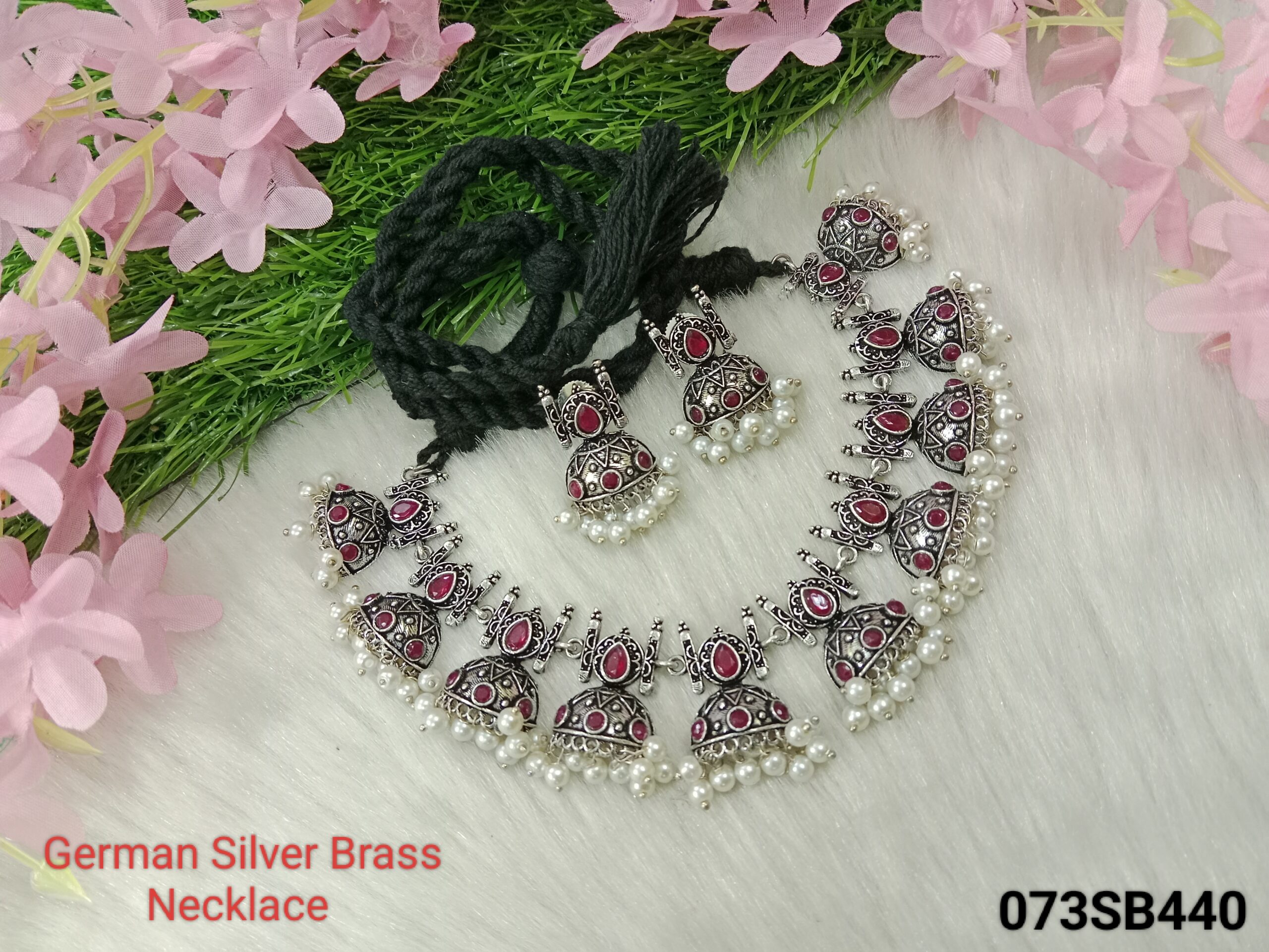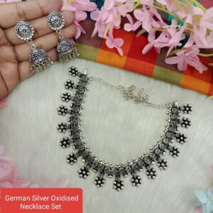 Discover timeless elegance with our German Silver Brass Necklace Set. This exquisite collection features intricately crafted necklaces and matching earrings, blending the lustrous beauty of German silver with the richness of brass accents. Each piece exudes sophistication and charm, making it the perfect accessory for special occasions or adding a touch of elegance to everyday wear. Elevate your style with this versatile set that seamlessly combines tradition and modernity.