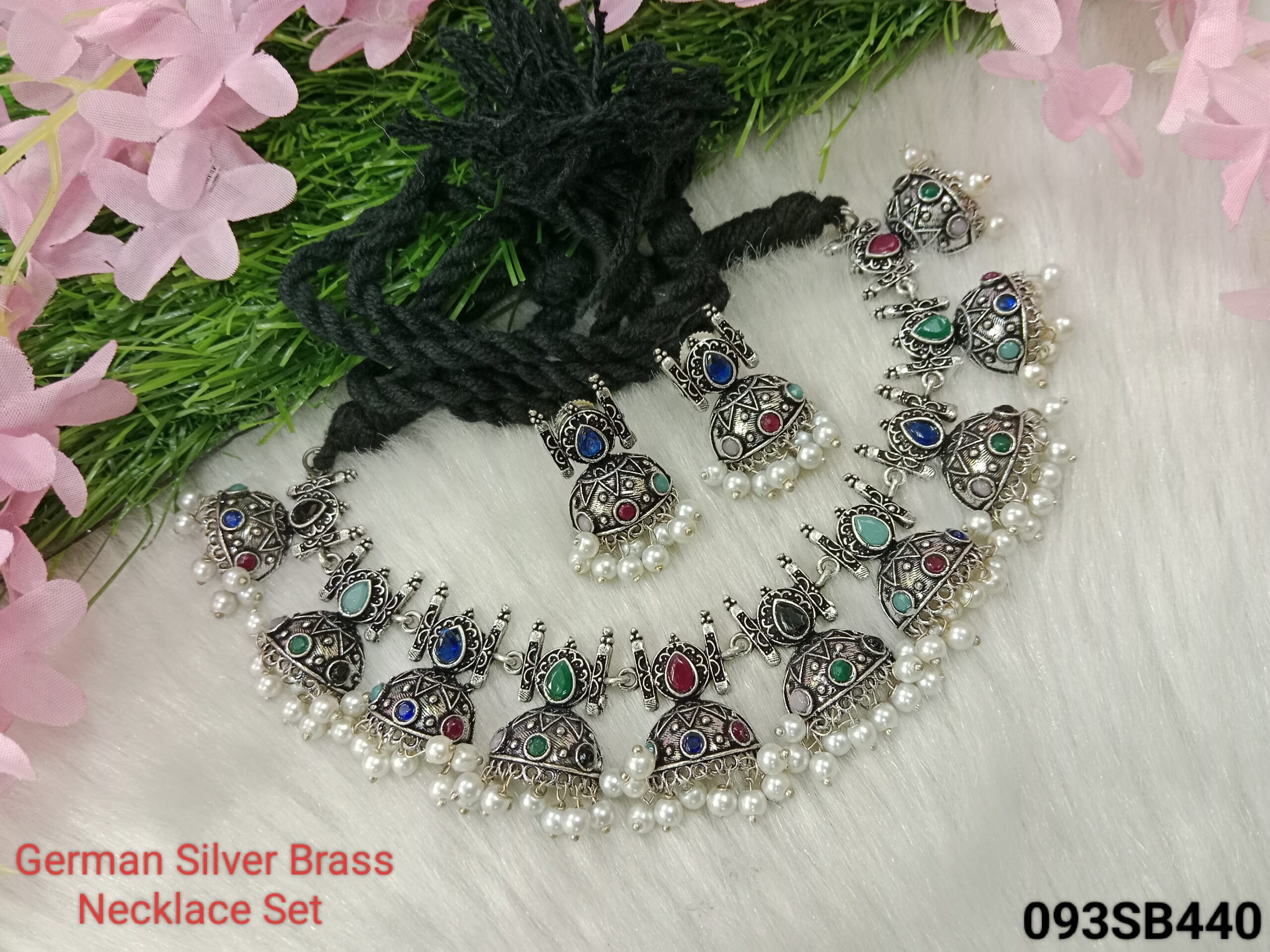 Discover timeless elegance with our German Silver Brass Necklace Set. This exquisite collection features intricately crafted necklaces and matching earrings, blending the lustrous beauty of German silver with the richness of brass accents. Each piece exudes sophistication and charm, making it the perfect accessory for special occasions or adding a touch of elegance to everyday wear. Elevate your style with this versatile set that seamlessly combines tradition and modernity.
