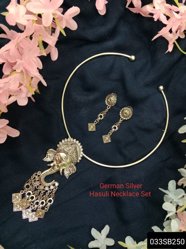 Embrace elegance with our German Silver Hasuli Necklace Set. This stunning ensemble features a intricately crafted Hasuli necklace and complementing earrings, all adorned with the timeless beauty of German silver. Each piece exudes sophistication and grace, making it the perfect accessory for any special occasion or to elevate your everyday style. Make a statement with this versatile set that seamlessly blends tradition with contemporary flair.