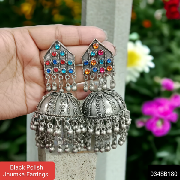 Black polish jhumka earrings are a trendy and stylish accessory. These earrings typically feature a black polish or coating on metal, giving them a sleek and sophisticated look. Jhumka earrings originate from India and are characterized by their bell-shaped design, often adorned with intricate patterns or embellishments. The combination of black polish and the traditional jhumka style creates a unique and eye-catching piece of jewelry that can complement a variety of outfits, from casual to formal. They’re perfect for adding a touch of elegance and flair to any ensemble.