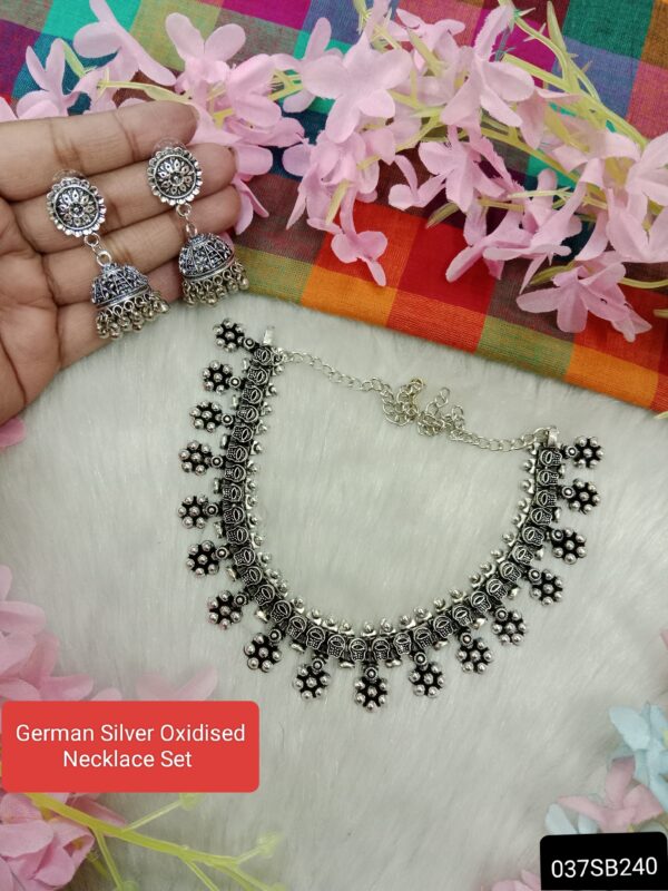 A German silver oxidized necklace set is a stunning ensemble of jewelry crafted from German silver, an alloy primarily composed of copper, nickel, and zinc, known for its durability and lustrous appearance. This necklace set undergoes an oxidization process, resulting in a darkened or antique finish that enhances its intricate design details. The set typically includes a necklace paired with matching earrings or other accessories. Adorned with traditional motifs, geometric patterns, or intricate filigree work, these sets offer a timeless and elegant aesthetic. Perfect for both casual and formal occasions, German silver oxidized necklace sets add a touch of sophistication and cultural charm to any ensemble.