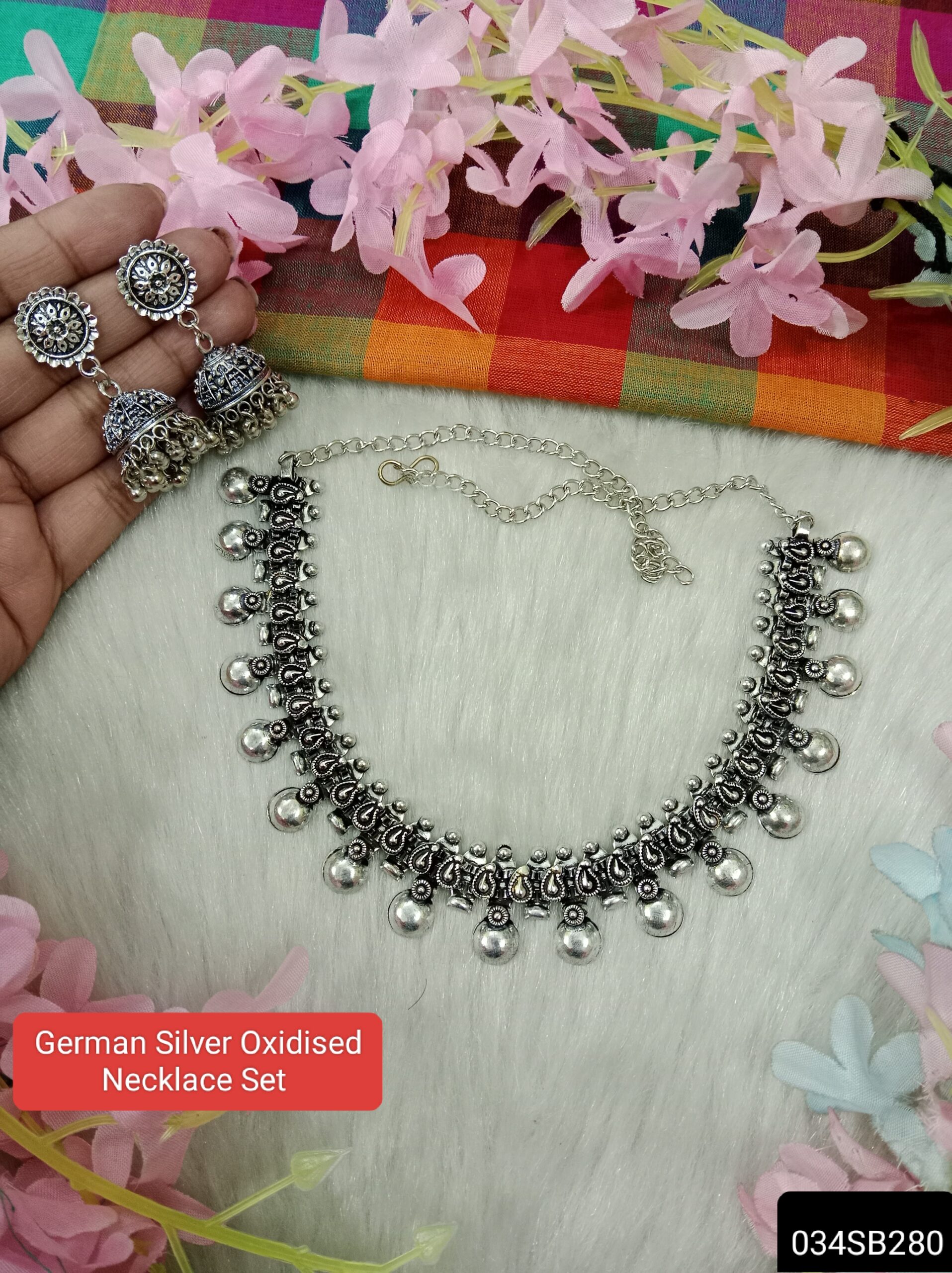 A German silver oxidized necklace set is a stunning ensemble of jewelry crafted from German silver, an alloy primarily composed of copper, nickel, and zinc, known for its durability and lustrous appearance. This necklace set undergoes an oxidization process, resulting in a darkened or antique finish that enhances its intricate design details. The set typically includes a necklace paired with matching earrings or other accessories. Adorned with traditional motifs, geometric patterns, or intricate filigree work, these sets offer a timeless and elegant aesthetic. Perfect for both casual and formal occasions, German silver oxidized necklace sets add a touch of sophistication and cultural charm to any ensemble.