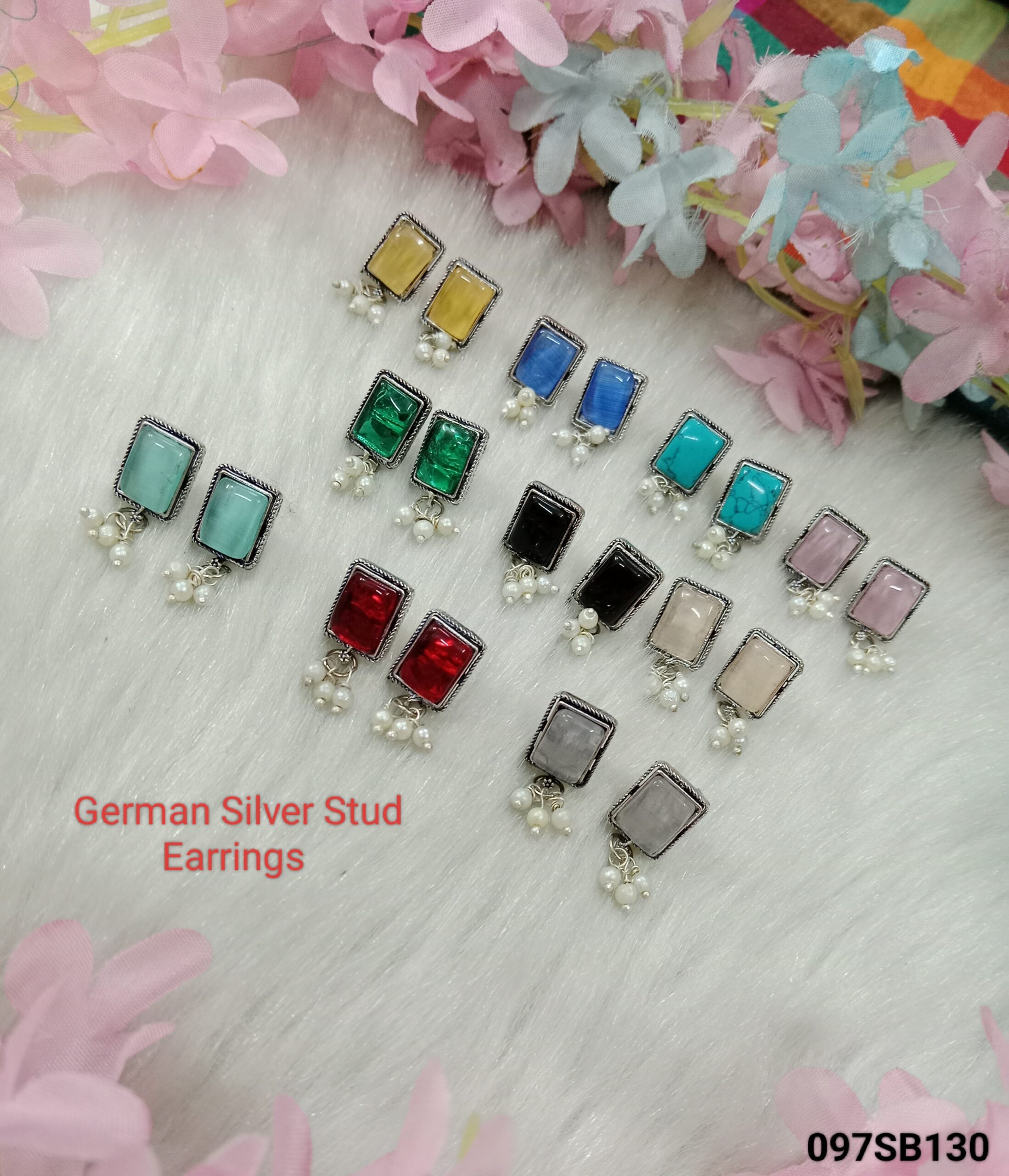 German silver stud earrings are classic and versatile accessories crafted from German silver, an alloy composed primarily of copper, nickel, and zinc. These earrings feature a simple yet elegant design, typically consisting of a small decorative element or gemstone secured to a post that rests comfortably on the earlobe. The silver hue of the alloy complements a wide range of outfits and styles, making them suitable for both casual and formal occasions. Known for their durability and lustrous appearance, German silver stud earrings add a touch of timeless sophistication to any ensemble, making them a staple accessory in any jewelry collection.