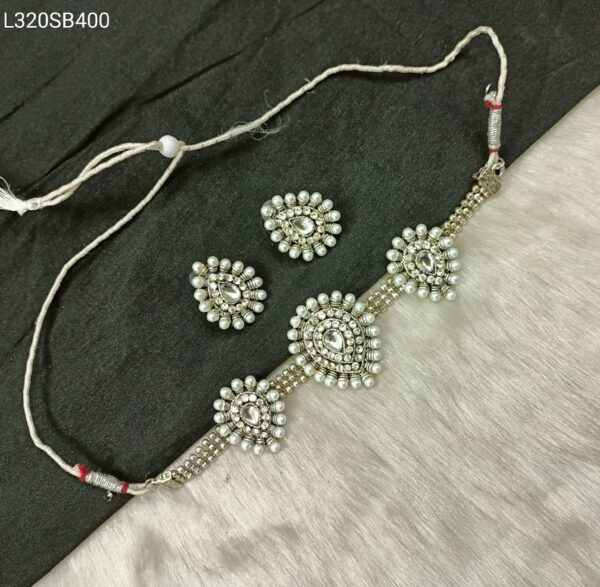 Elevate your neckline with our stunning silver choker set. Crafted with elegance in mind, this set features a sleek choker adorned with intricate silver detailing, complemented by coordinating earrings for a complete look. Perfect for adding a touch of sophistication to any outfit, whether it’s for a special occasion or everyday wear, this choker set exudes timeless charm and effortless style.