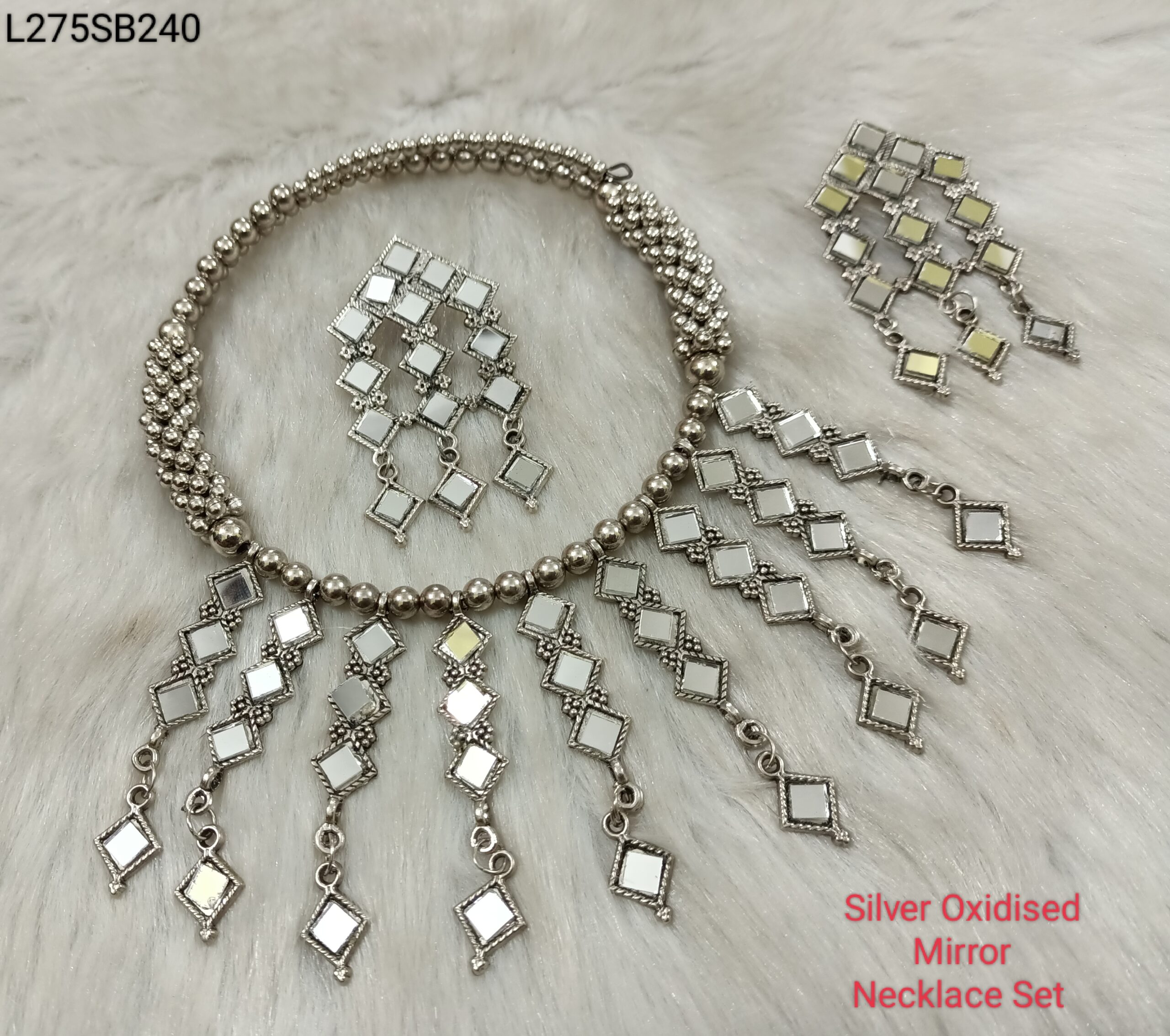 A silver oxidized mirror necklace set is a stunning ensemble of jewelry pieces typically crafted from silver and oxidized to achieve a darkened, antique finish. The set usually includes a necklace adorned with intricately designed pendants or motifs, complemented by matching earrings. The incorporation of mirrors adds a touch of glamour and reflects light, enhancing the overall elegance of the set. This type of jewelry often draws inspiration from traditional or cultural designs, making it a beautiful choice for special occasions or as statement pieces to elevate your everyday attire.