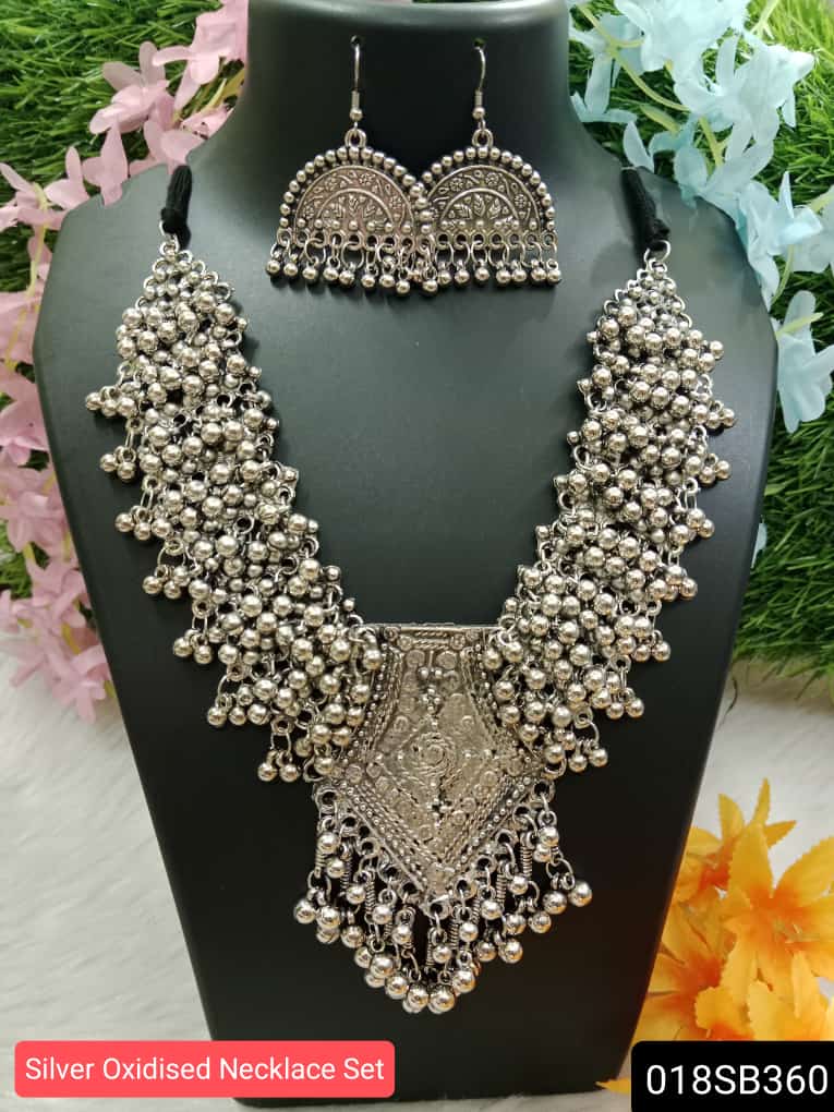 The Silver Oxidized Necklace Set combines timeless elegance with a touch of vintage charm. Crafted from silver and treated with an oxidized finish, this set boasts a unique weathered appearance with darkened accents. The necklace features intricate patterns or motifs, complemented by matching earrings for a coordinated look. Versatile enough to pair with both traditional and contemporary outfits, this set adds a sophisticated flair to any ensemble, making it ideal for special occasions or everyday wear.