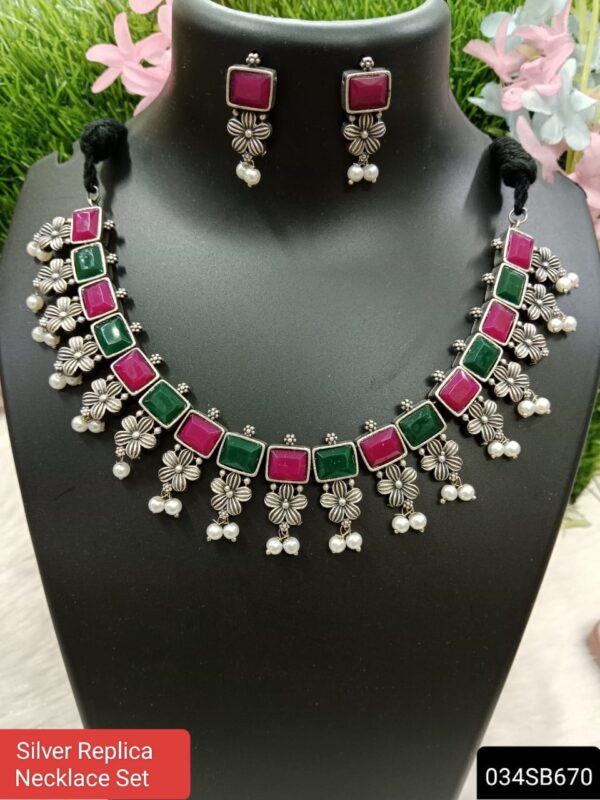 Experience the allure of silver with our exquisite replica necklace set. Crafted to mimic the elegance of genuine silver, this set boasts a timeless design that radiates sophistication. The necklace features intricate detailing and a shimmering finish, while the coordinating earrings add a touch of glamour. Perfect for those who desire the beauty of silver at an affordable price, this replica set elevates any outfit with its undeniable charm and elegance.